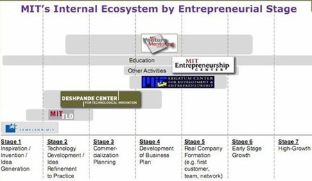 MIT的各種組織形成了學校內定的創業體系:從最初期鼓勵發明創新的Lemelson項目,到負責申請專利為初創公司發放牌照的審批部門 (TLO),說明改善商業企劃、組建公司的Legatum中心,通過符合業內人士為創業者提供一對一長期指導的服務機構,以及貫穿始終的創業中心。正是這一生態體系架起了一道橋樑。