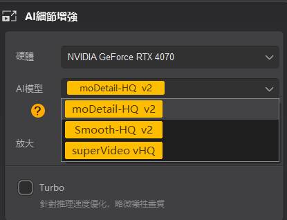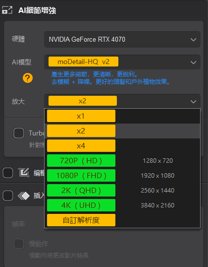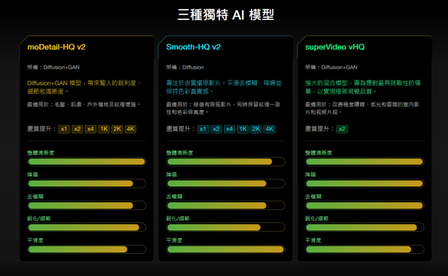 該軟體結合了客製化的 AI 模型,用於特定任務,例如去模糊、音訊降噪、幀插值和 4K 增強。
