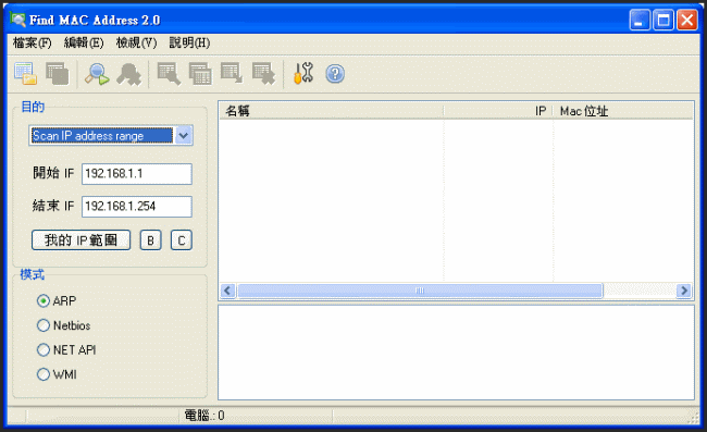 找出區功能變數網路中所有電腦的MAC位址,可以快速搜集區功能變數網路中所有電腦、裝置的工具。