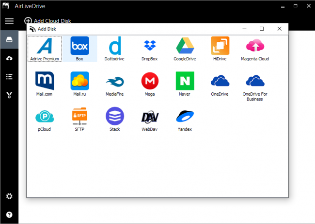 它目前支援幾乎所有國際流行的雲磁碟機服務,例如OneDrive,OneDrive for Business,Google Drive,Box,Dropbox,Mega,Yandex.Disk,MediaFire。