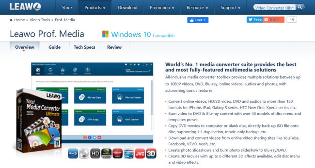 As an all-inclusive media converter suite, Leawo Prof. Media ensures your movie night with high quality and smooth movie watching experience. Comprising HD video converter, Free audio converter, DVD Ripper, Blu-ray Creator, DVD Copy, DVD Creator, Photo Slideshow Maker, Photo Slideshow Burner, and Free YouTube Downloader, this media converter suite easily solves any format incompatibility issue.