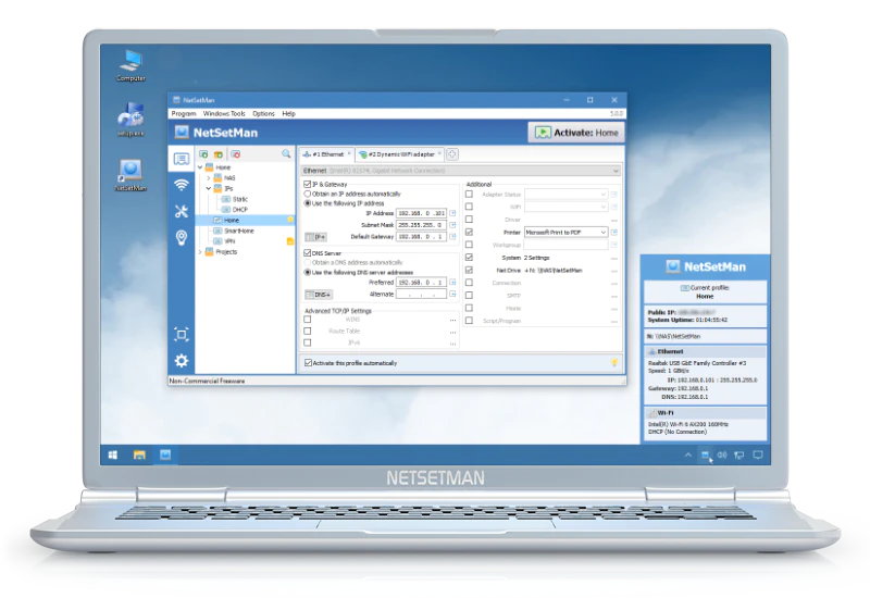 NetSetMan offers what you’ve been missing in Windows until now: A powerful, easy-to-use interface to manage all your network settings at a glance. Give it a try and you’ll never want to be without it again.