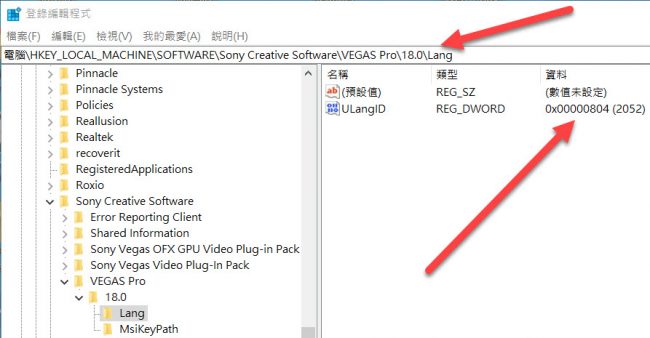 [HKEY_LOCAL_MACHINE\SOFTWARE\Sony Creative Software\Vegas Pro\18.0\Lang]