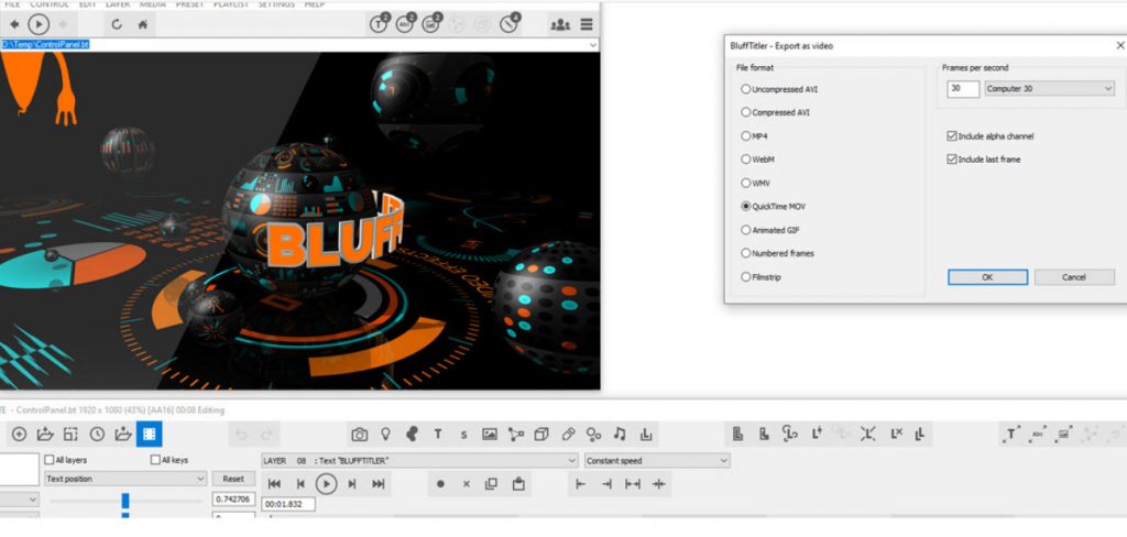 以任何解析度,幀率,壓縮率(無論是否帶有Alpha通道)將標題匯出為視訊檔案(MP4,AVI)或編號的幀(JPG,PNG)。