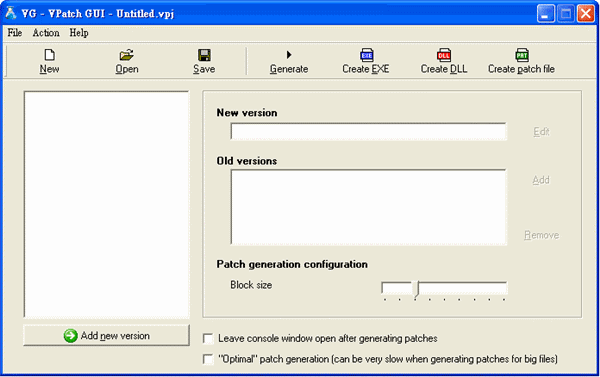 從 VPatch v3.0 開始,增加了使用者圖形介面 (GUI),並能建立可獨立運行的 Exe 或 Dll 檔案(分別使用「運行庫」