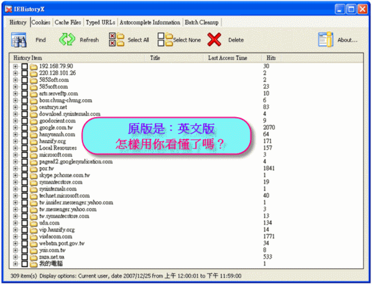 卸載清理- IEHistoryX-1.6.0.8是:一個可以搜尋,檢視,以及有選取性的移除ie歷史記錄,cookie檔案,ie快取檔案,