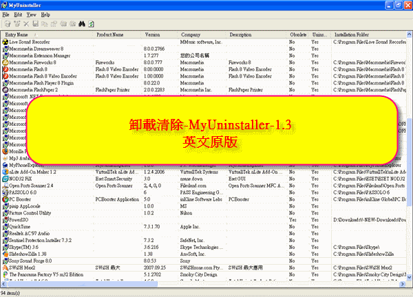 MyUninstaller 是一個可以用來代替標準的 Windows 動作系統的加入或移除程式元件的程式。
