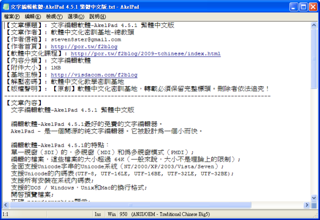 文字編輯軟體-AkelPad 4.5.1 繁體中文版下載之檔案位址: