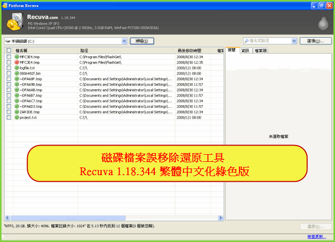 【文章標題】: 磁碟檔案誤移除還原工具 Recuva 1.18.344 繁體中文化綠色版