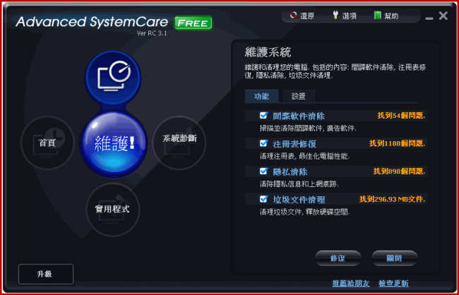 利用 Advanced WindowsCare 3.1的清理修復功能,來將電腦中的垃圾檔案、註冊表錯誤和可能有害的漏洞移除