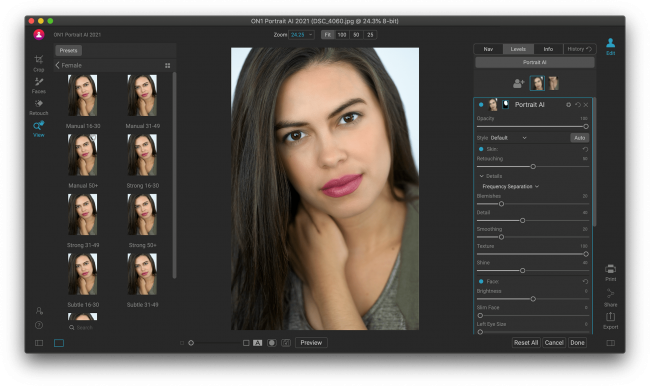 【AI人臉自動修飾】ON1 Portrait AI 2021 v15 輕鬆去除瑕疵.基於頻率分離的皮膚修飾