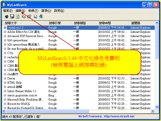 MyLastSearch 1.44 中文化綠色版(檢視電腦上網搜尋記錄)