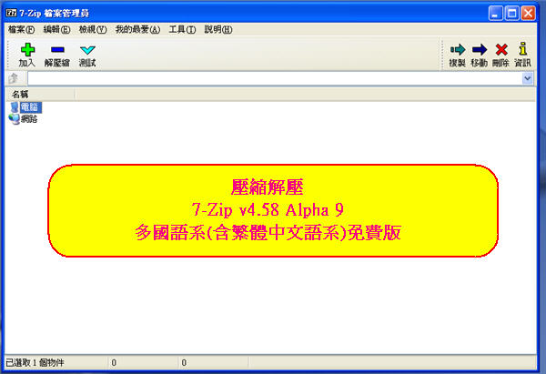壓縮解壓-7-Zip v4.58 Alpha 9 多國語系(含繁體中文語系)免費版